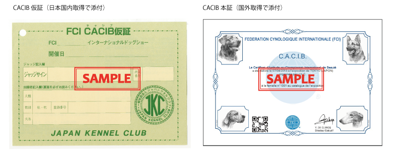 | (注2) | 日本国内で取得した場合は当日交付されたCACIB仮証を、国外で取得した場合はFCI公式HPに公示されたCACIB本証を印刷、添付して下さい。CACIB本証公示の確認及び印刷方法はこちら>>>。 |