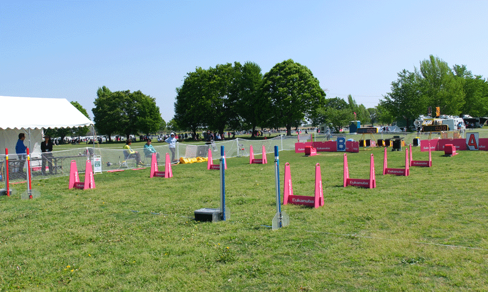 コース上に置かれたハードルは4台。その先にボールをセットした「ボックス」が置いてあります。ハードルは、犬の体高に合わせて調整されます。