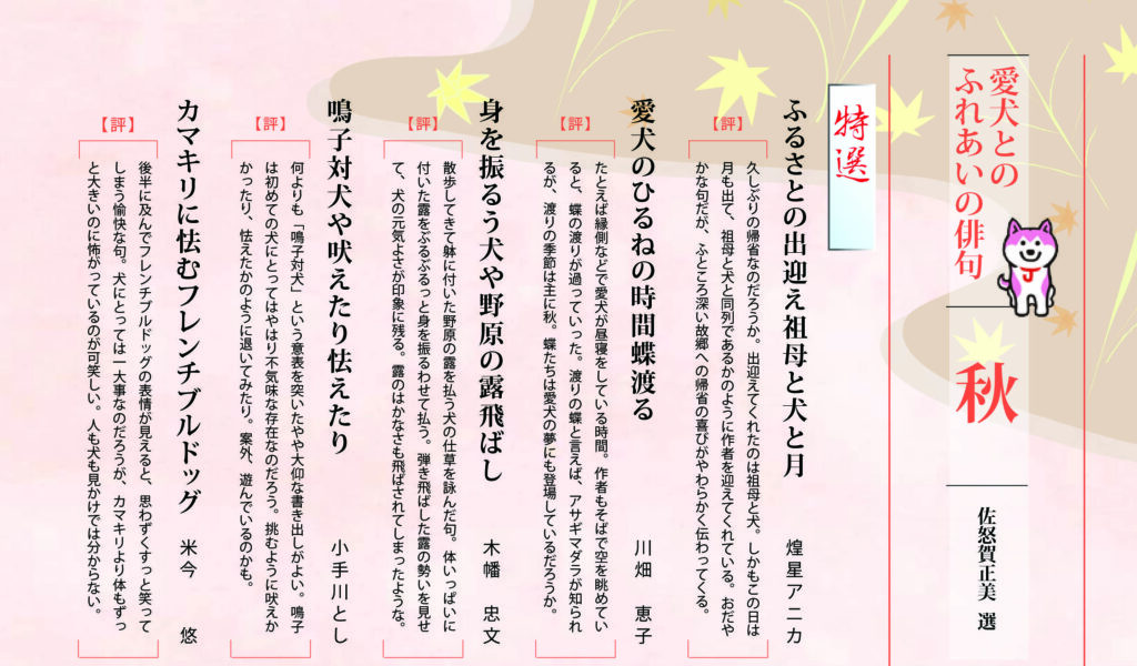 本会が主催する日本で唯一の「犬」をテーマにした俳壇は、「春」(1〜3月)、「夏」(4〜6月)、「秋」(7〜9月)、「冬」(10〜12月)の年間4回開催しており、ご選句は、現代俳句協会の佐怒賀正美先生にお願いしております。