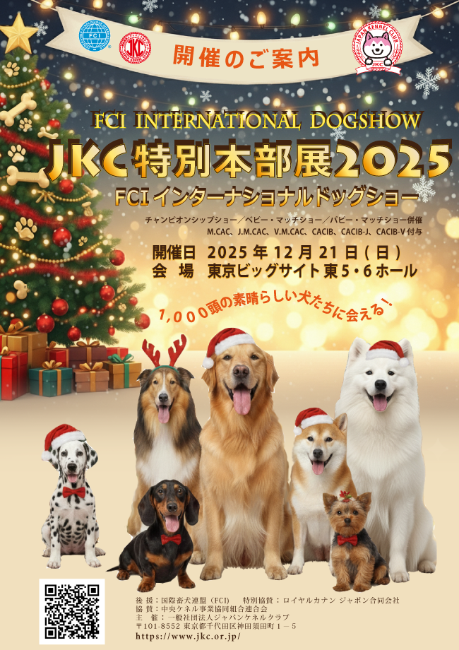 2025年12月21日(日)に、東京ビッグサイトで『JKC特別本部展2025 FCIインターナショナルドッグショー』が開催されるよ。
